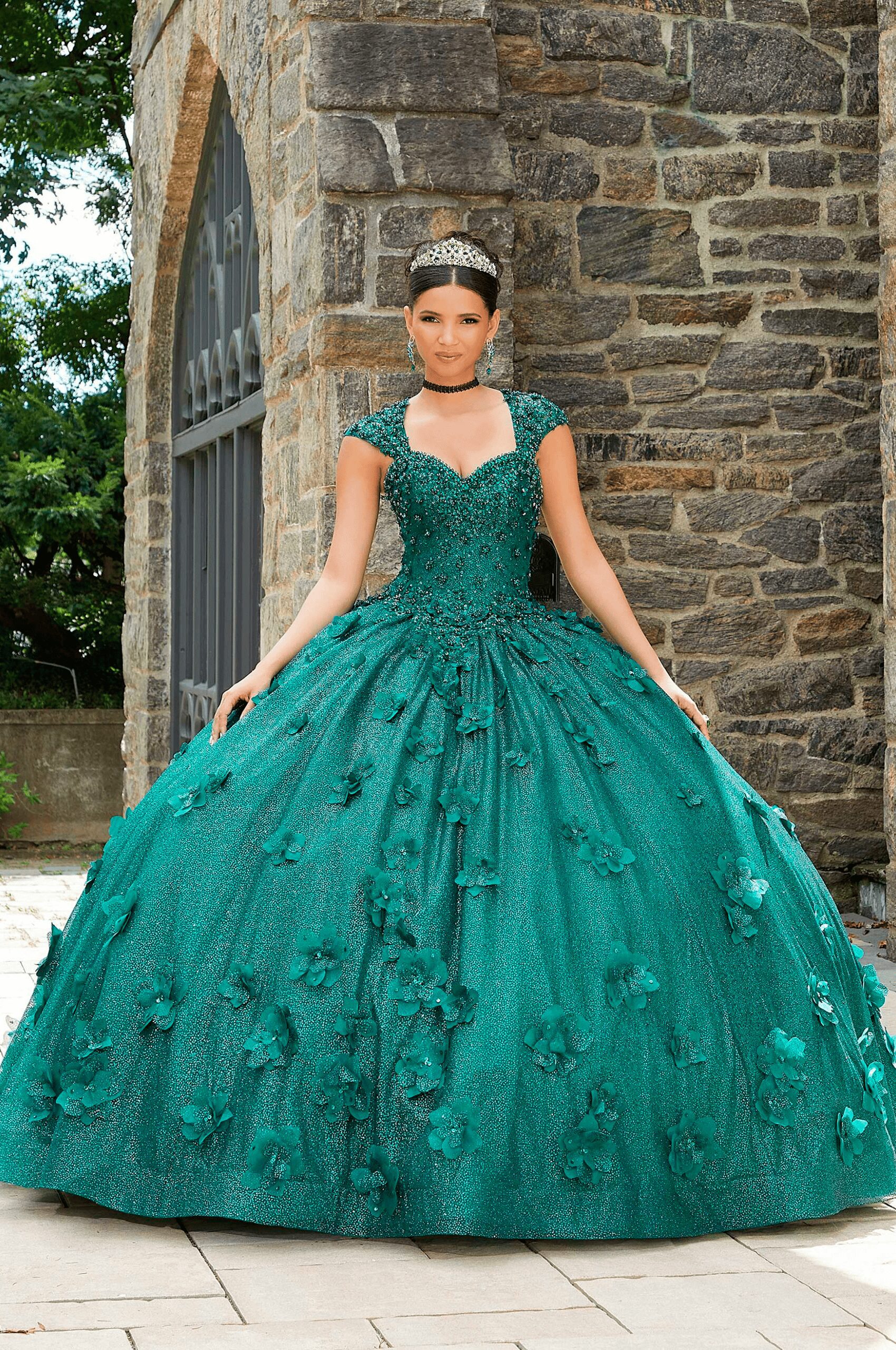 El resplandeciente vestido de quinceañera tiene flores tridimensionales con cuentas de joya sobre un tul resplandeciente y brillante sobre una falda plisada con un escote corazón sin tirantes. Este es el vestido de quinceañera perfecto para una quinceañera única que le gusta estar en tendencia y resaltar todo la noche.